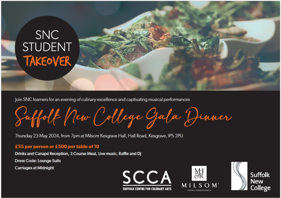 Suffolk New College invites you to an enchanting evening of culinary delights and captivating musical performances at the SNC Gala Dinner, taking place on Thursday 23 May 2024, at the exquisite Milsom Kesgrave Hall.