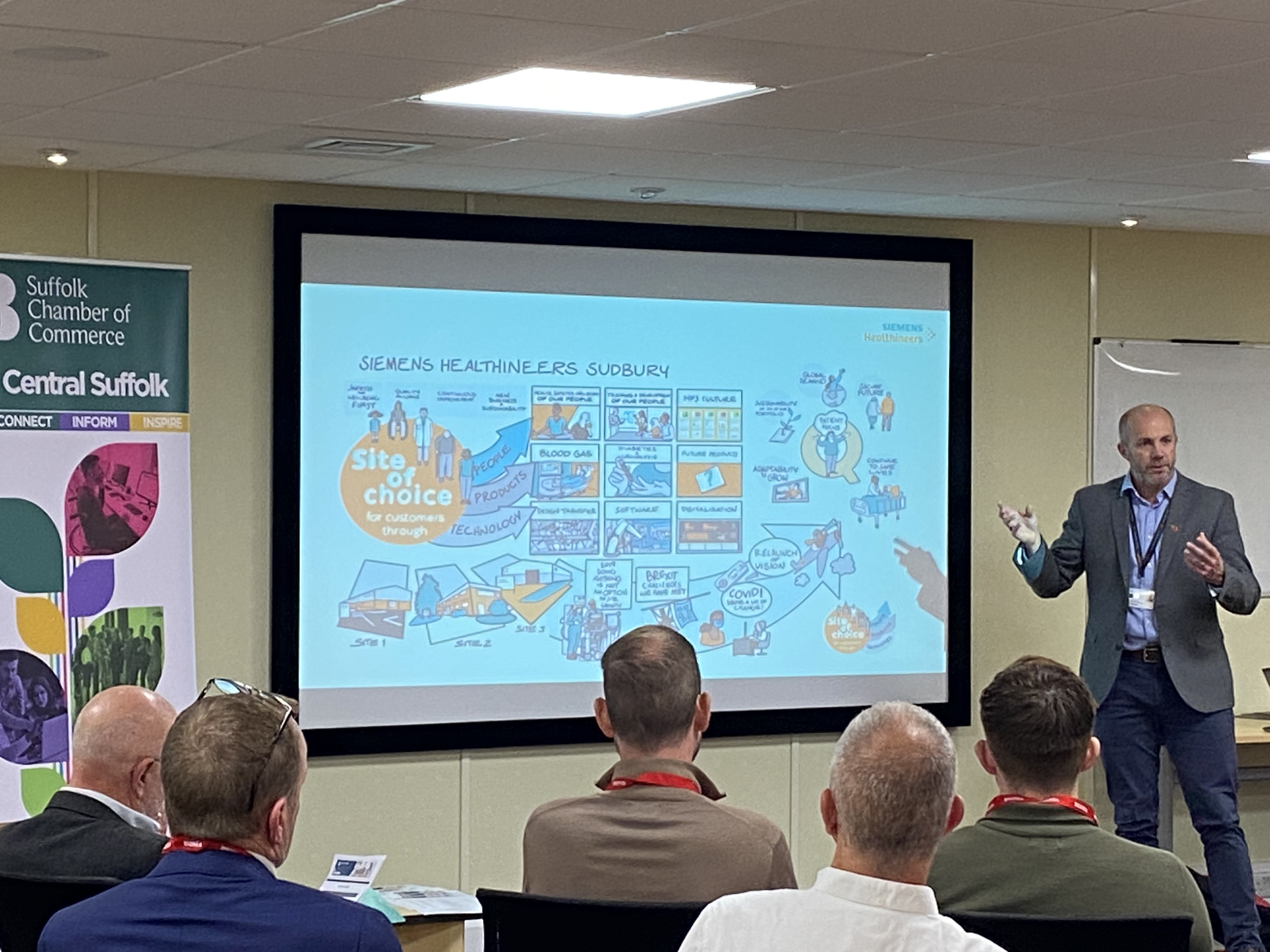 The autumn meeting of Suffolk Chamber’s Central Suffolk Forum was held at Siemens Healthineers in Sudbury. Chambers members learnt about the vitally important specialist instrumentation for laboratories and hospitals that is assembled in Sudbury by Siemens; the new Babergh economic strategy and how a focus on sustainability is the key to growth for a number of enterprising businesses in Babergh.